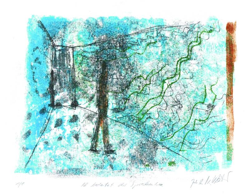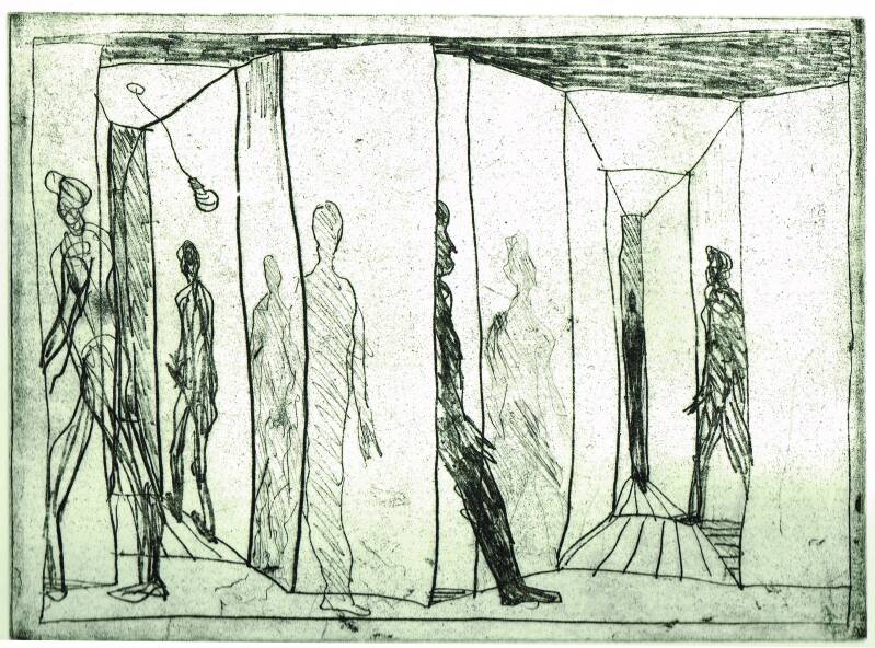 Radierungen und Monotypien zu "Gegen Null" von Lars Gustafsson, Ausstellung in der Galerie am Savignyplatz, Berlin 2013, gemeinsam mit Skulpturen von Lars Gustafsson