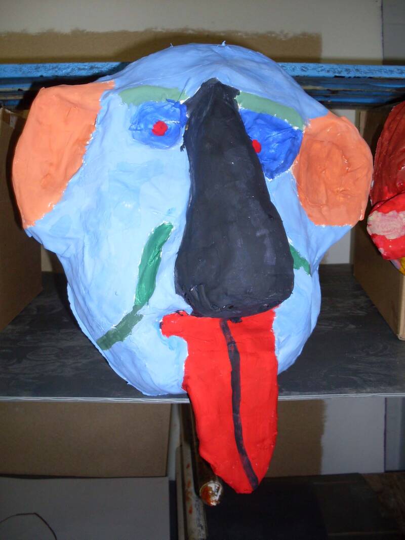 Fertigung von Tonformen, Maske Abformung aus Stoff und Kleister-Leimmischung, dann Bemalung mit Acrylfarbe