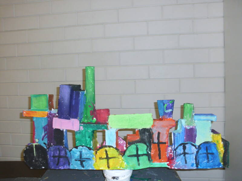 Herstellung von Skulpturen aus Schachtel und Kartons, Kaschur mit Zeitungspapier und Kleister-Leimmischung, anschließend Bemalung mit Acrylfarbe